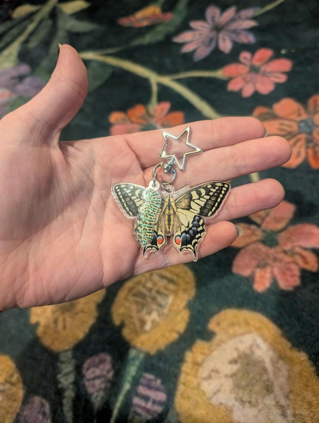 Amazing quality and the print is perfect. Sleek silky glossy sheen and sparkles so much when the light catches it right!! Beautiful detailing I love the lil caterpillar guy and the star shaped latch is a great finishing touch!