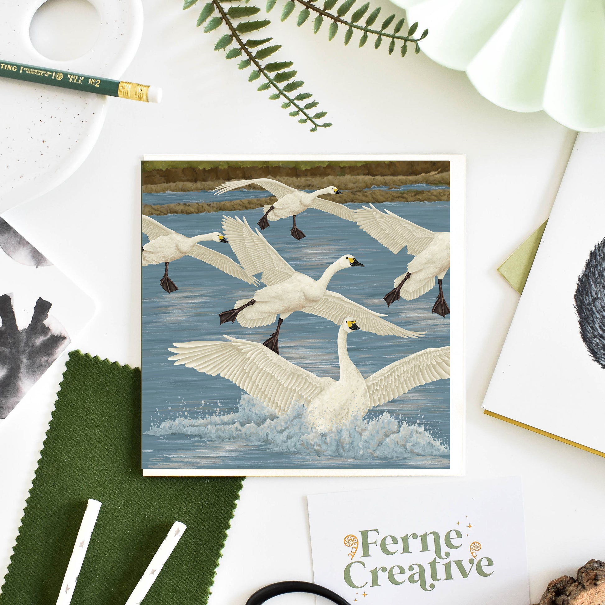 A detailed wildlife greeting card featuring a flock of Bewick’s Swans (Cygnus columbianus bewickii) arriving and landing on a tranquil water scene. The illustration captures the grace and movement of the swans in flight, as well as the reflective quality of the water, creating a dynamic and naturalistic depiction. Printed in the UK on 148 × 148 mm uncoated stock for a soft, matte finish that brings out the colours and fine details. Each card comes blank for your own message and includes a kraft envelope.