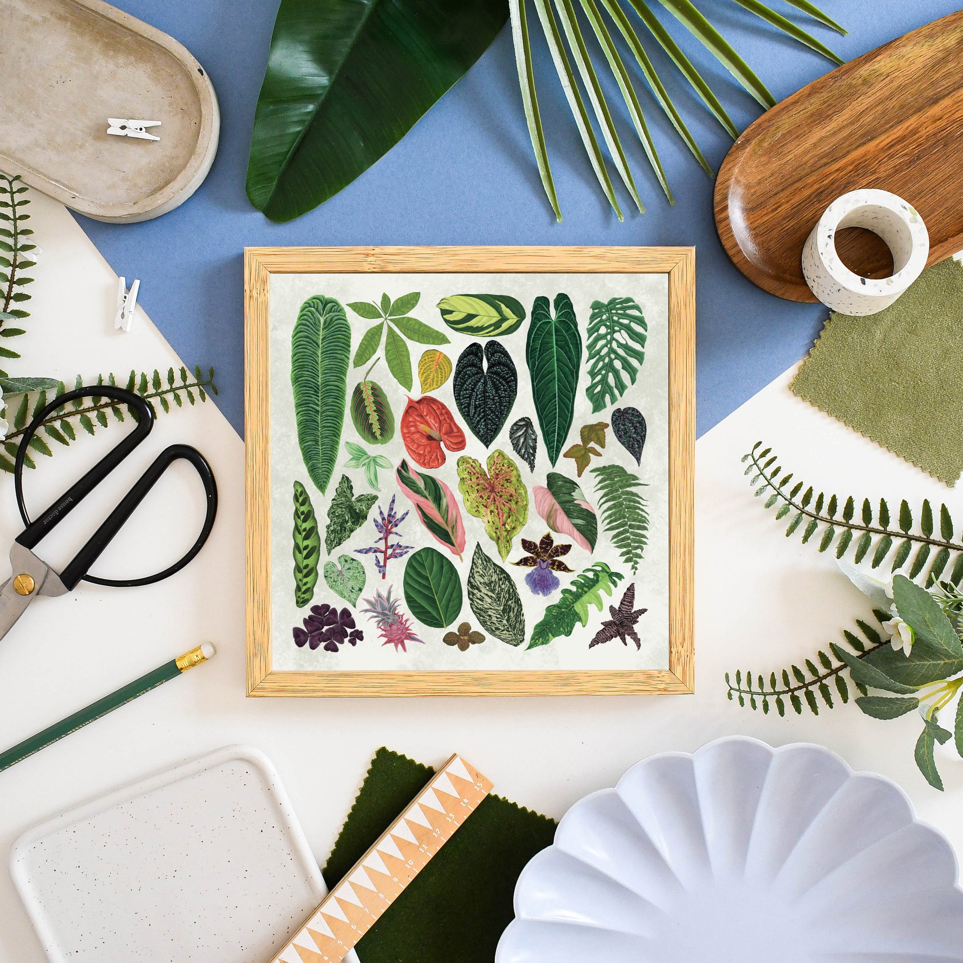 A detailed square art print featuring a vibrant composition of tropical foliage and flowers, drawn from a diverse range of houseplants showcased in our RHS Show Garden at the Malvern Spring Show. The illustration was originally created as part of a collaborative garden installation with Sprouts of Bristol, designed to celebrate the rich botanical diversity found in cultivated indoor plants.