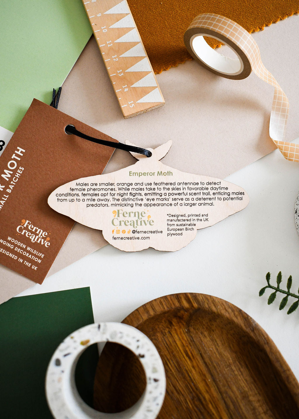 Delight in the beauty of British wildlife with our Emperor moth wooden decoration. Perfect as a Yule tree ornament or a unique piece of home decor, this illustrated ornament brings a touch of nature's majesty into your living space. Handcrafted from sustainably sourced birch plywood, this Emperor moth decor is not just a charming addition to your home, but also a nod to environmental consciousness.