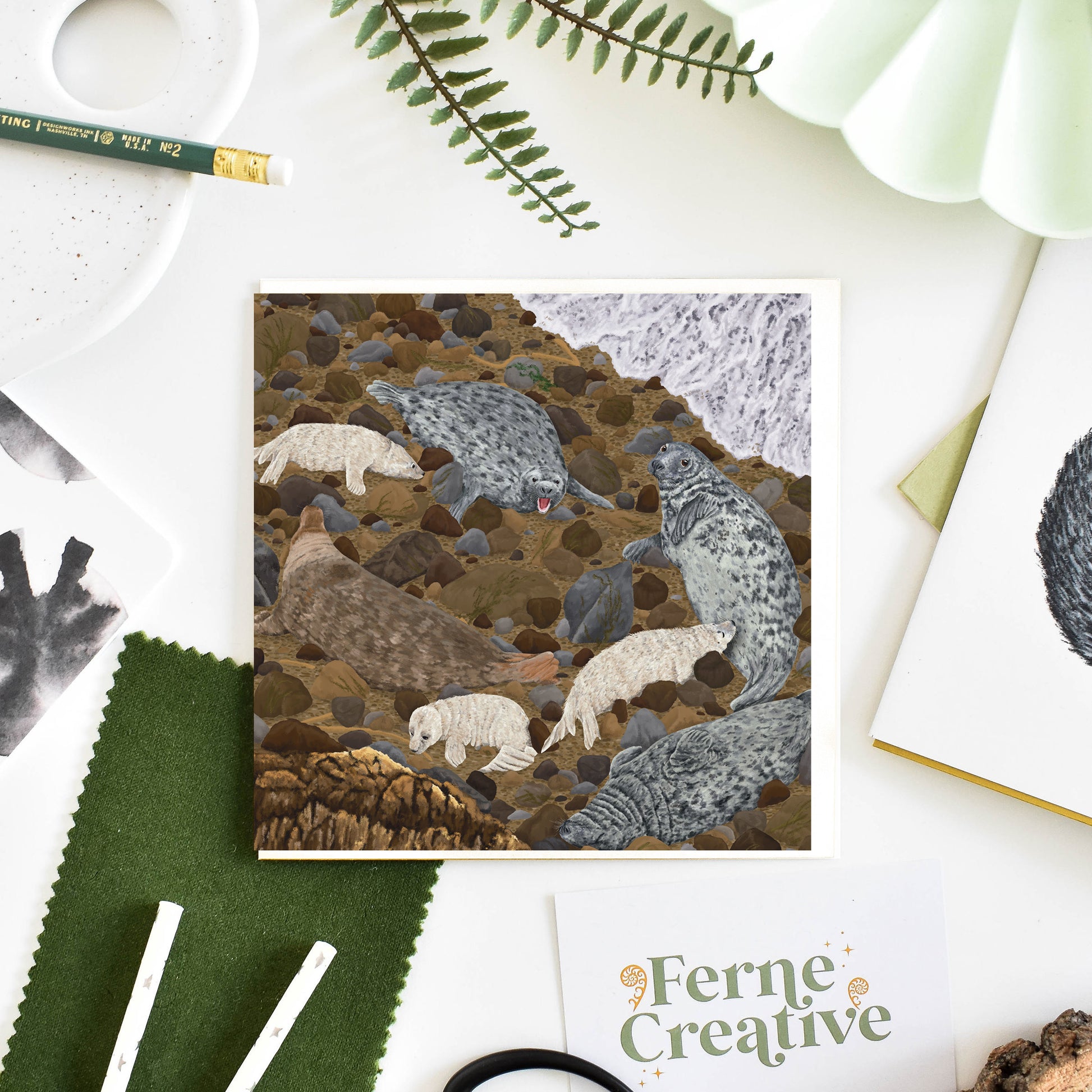 This square greeting card features a detailed illustration of Grey Seals (Halichoerus grypus) in a pupping scene on a rocky British beach. Printed in the UK on 148 × 148 mm uncoated stock for a soft, matte finish that highlights the textures and subtle colouring of the seals and their coastal habitat. Each card comes blank for your own message and includes a kraft envelope.