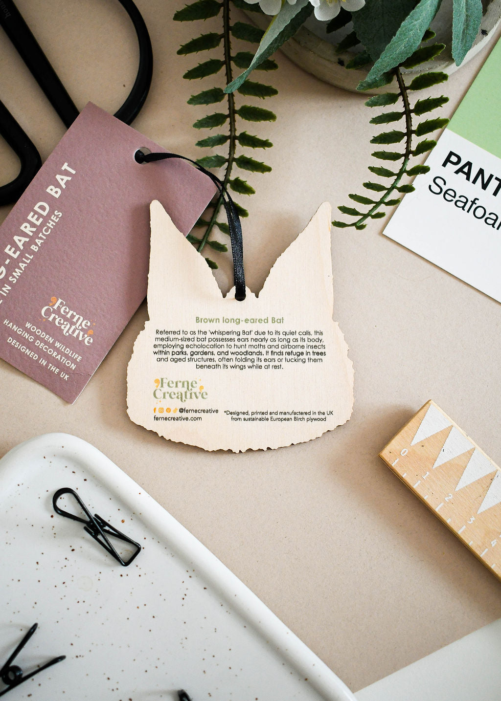 Add a touch of enchanting woodland charm to your home with this one-of-a-kind Long-Eared Bat Wooden Decoration. Perfectly capturing the captivating beauty of British wildlife, this illustrated ornament is a must-have for nature lovers and conservationists alike. Whether you're looking to spruce up your Christmas or Yule tree, or add a whimsical touch to your Halloween decor, this bat ornament is sure to delight and inspire.