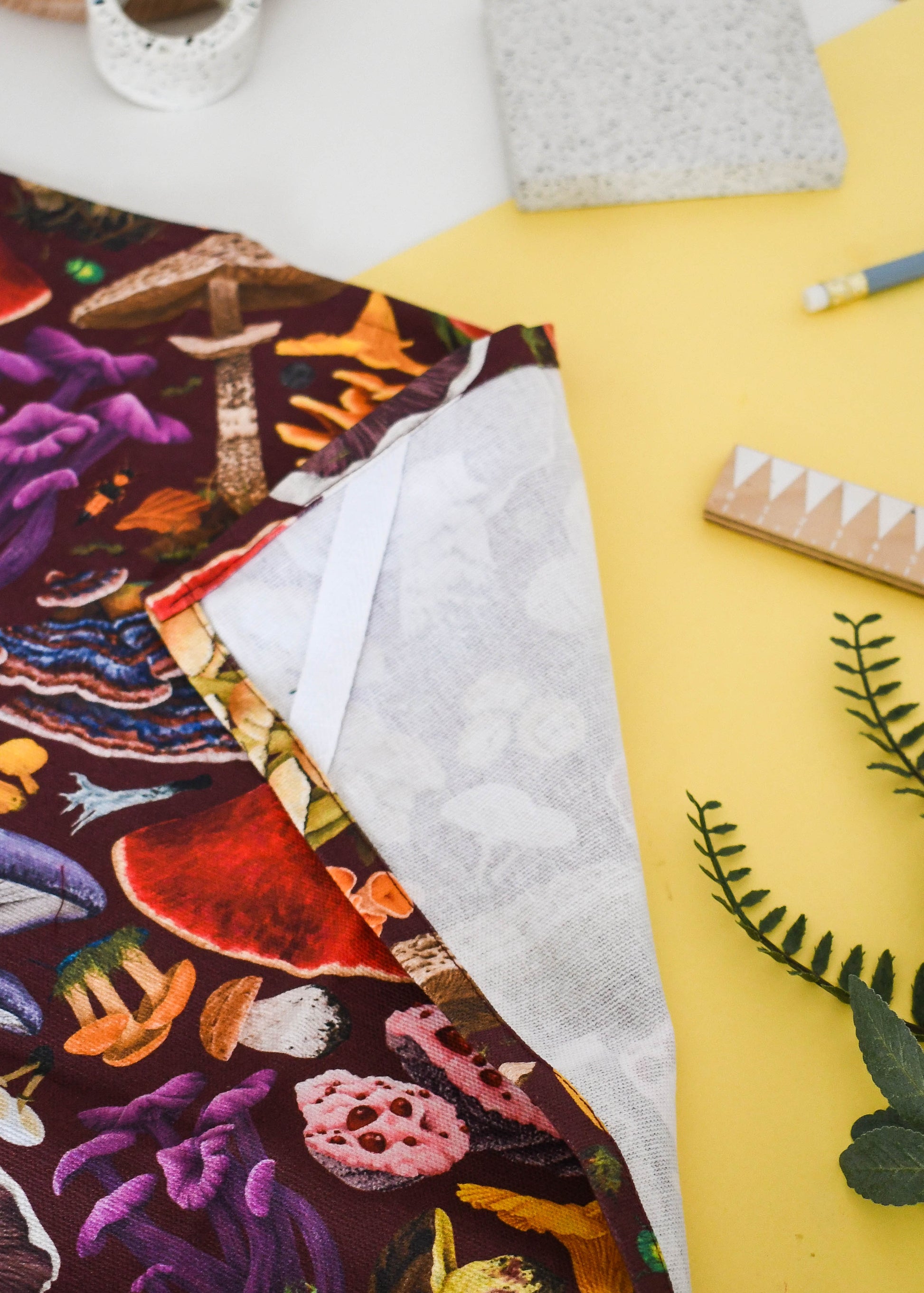 This tea towel showcases a collection of fungi found across Britain’s woodlands and meadows, from the broad parasol mushroom to the striking yellow folds of chicken of the woods. Each species is illustrated in careful detail against a rich burgundy red background, echoing the depth and colour often found on a woodland floor in autumn. The design brings together a variety of forms and textures, making it both a practical kitchen cloth and a quiet study in natural history.