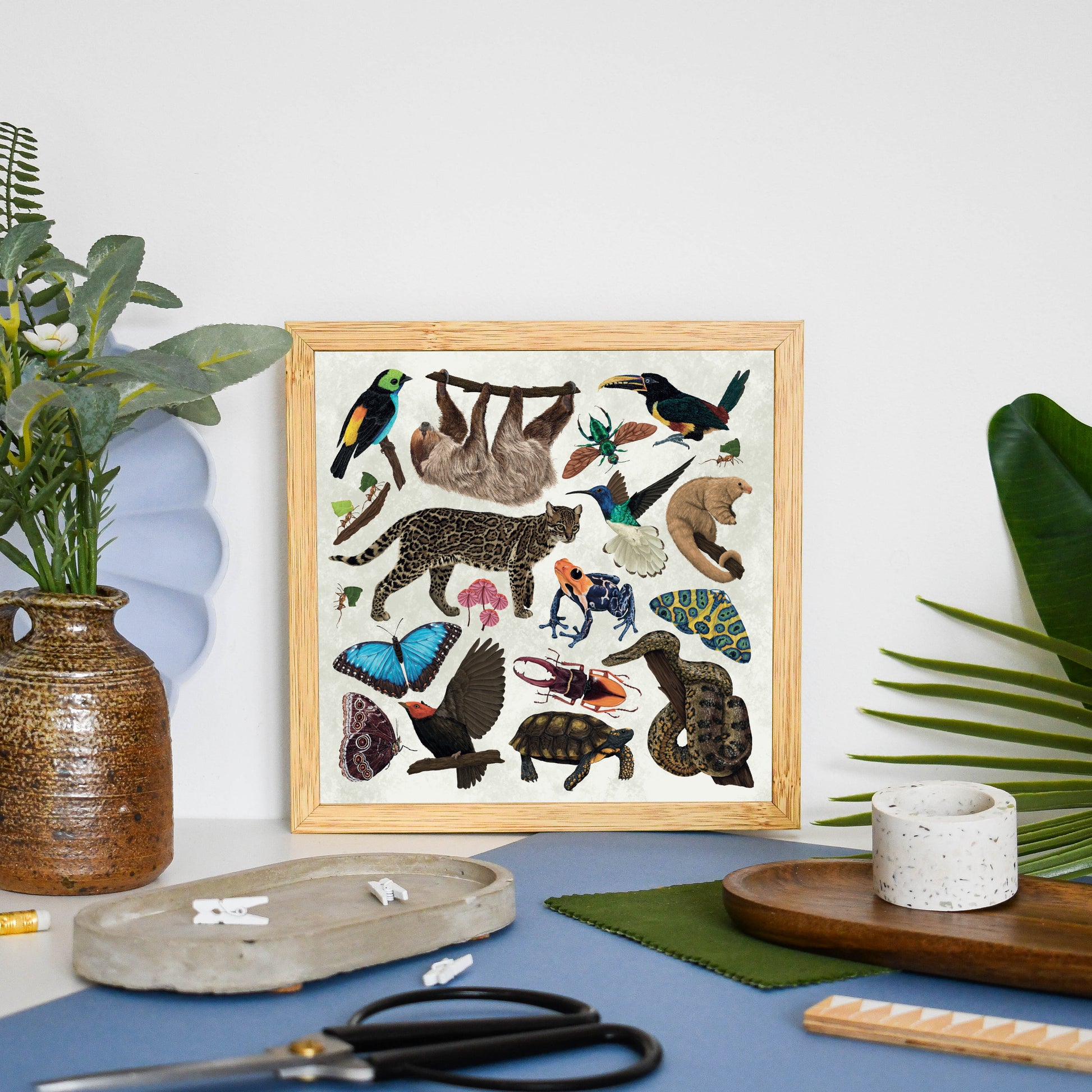 The extraordinary biodiversity of the Amazon Rainforest is captured in this square wildlife art print, illustrating a vibrant collection of species from one of the world’s most vital ecosystems. Originally created as part of a collaborative project for an RHS Show Garden at the Malvern Spring Show with Sprouts of Bristol, the illustration was first produced as a large-scale installation to showcase rainforest life.