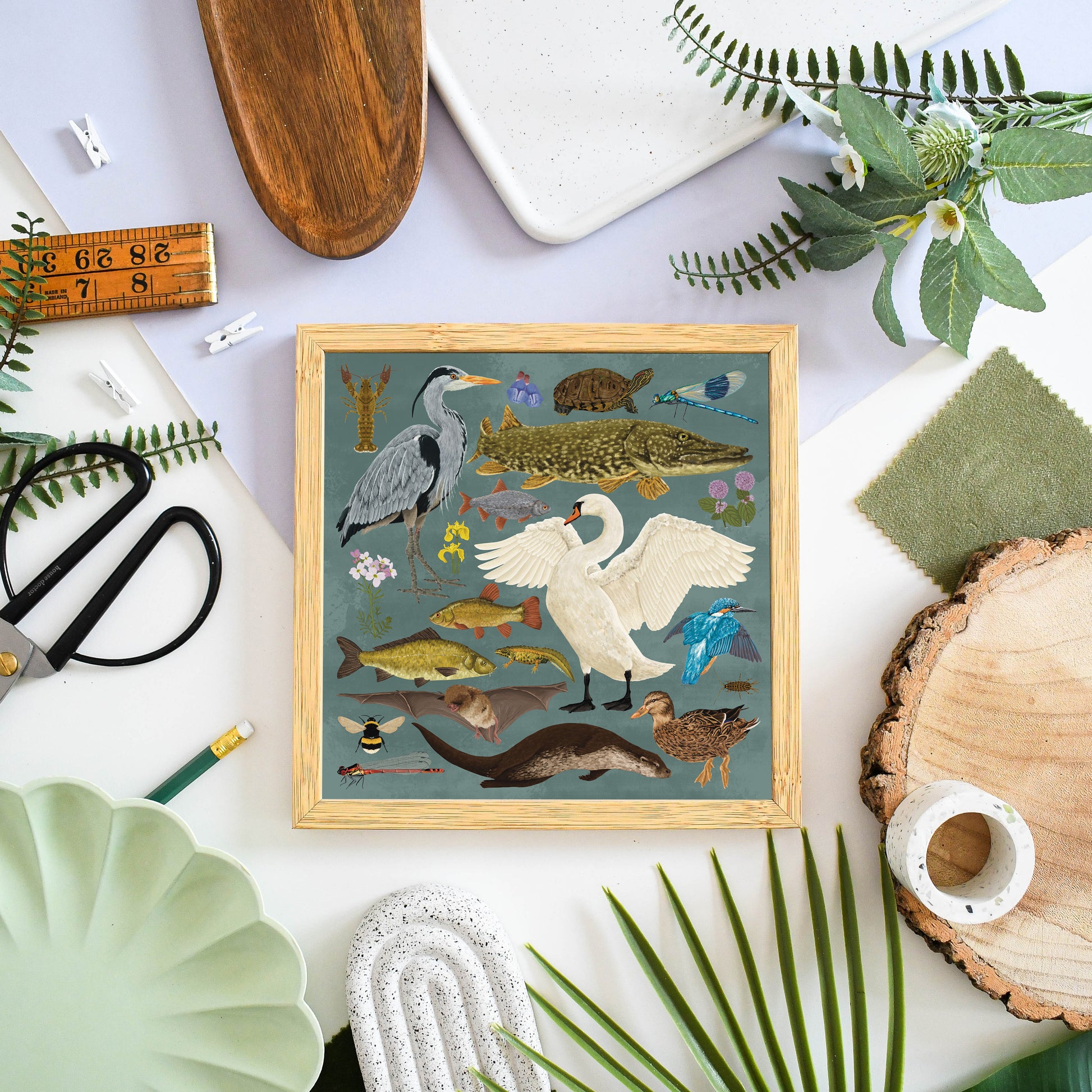 The calm waterways of Britain come alive in this square wildlife art print, capturing the diversity of species that thrive along canals and rivers. Illustrated in a naturalistic style, the artwork highlights both plants and animals found in these habitats, from tiny invertebrates to birds and mammals.