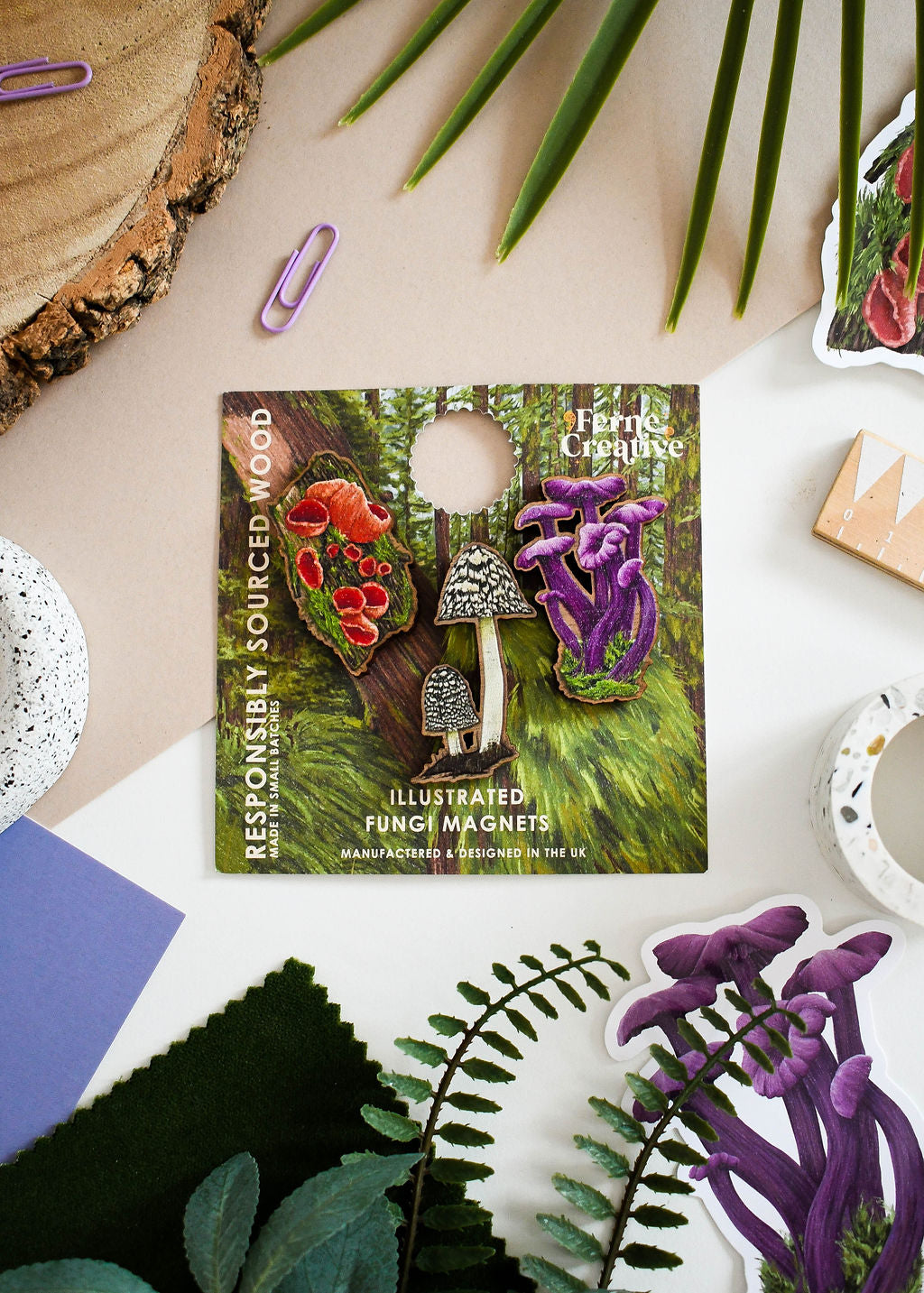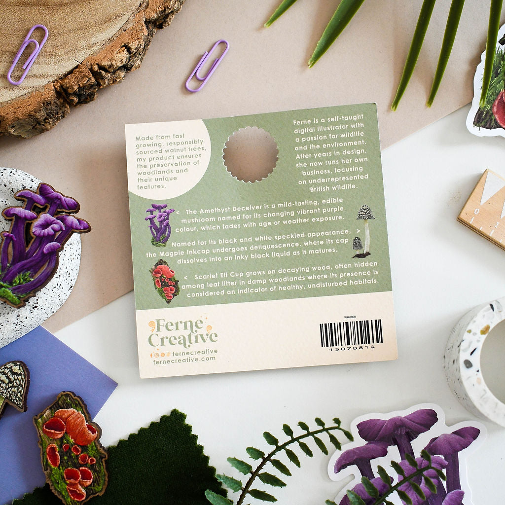 • Set of three wooden magnets (Amethyst Deceiver, Magpie Inkcap, Scarlet Elf Cup)