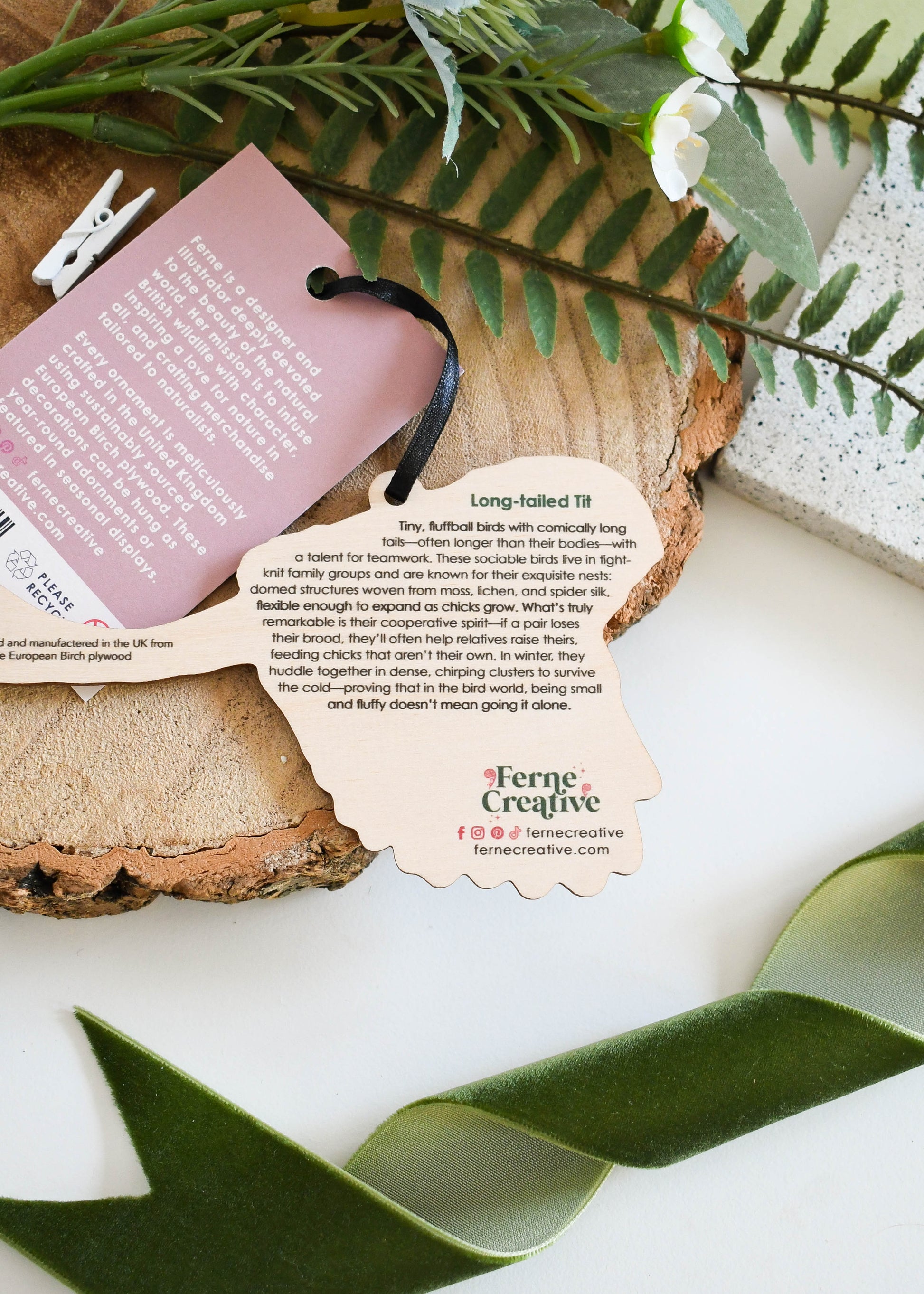 Delicate but resilient, the Long-tailed Tit is a familiar flash of pale pink and black in hedgerows and woodlands. This wooden hanging decoration captures its distinctive silhouette and fine plumage, laser-cut from sustainably sourced birch plywood and illustrated with care. These highly social birds are known for their remarkable family bonds—building complex, stretchy nests from moss and spider silk, and even helping relatives raise chicks if their own nests fail. More of these unique facts are printed on the reverse, making this piece a quiet celebration of cooperation and endurance in the natural world.