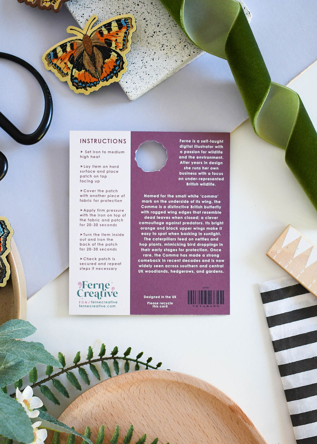 The Comma butterfly (Polygonia c-album) is recognised by its jagged wing edges and bright orange upperwings marked with dark spots. This iron-on patch is based on an original illustration and produced in high-quality woven fabric, capturing the species’ characteristic colours and distinctive wing shape in detail.