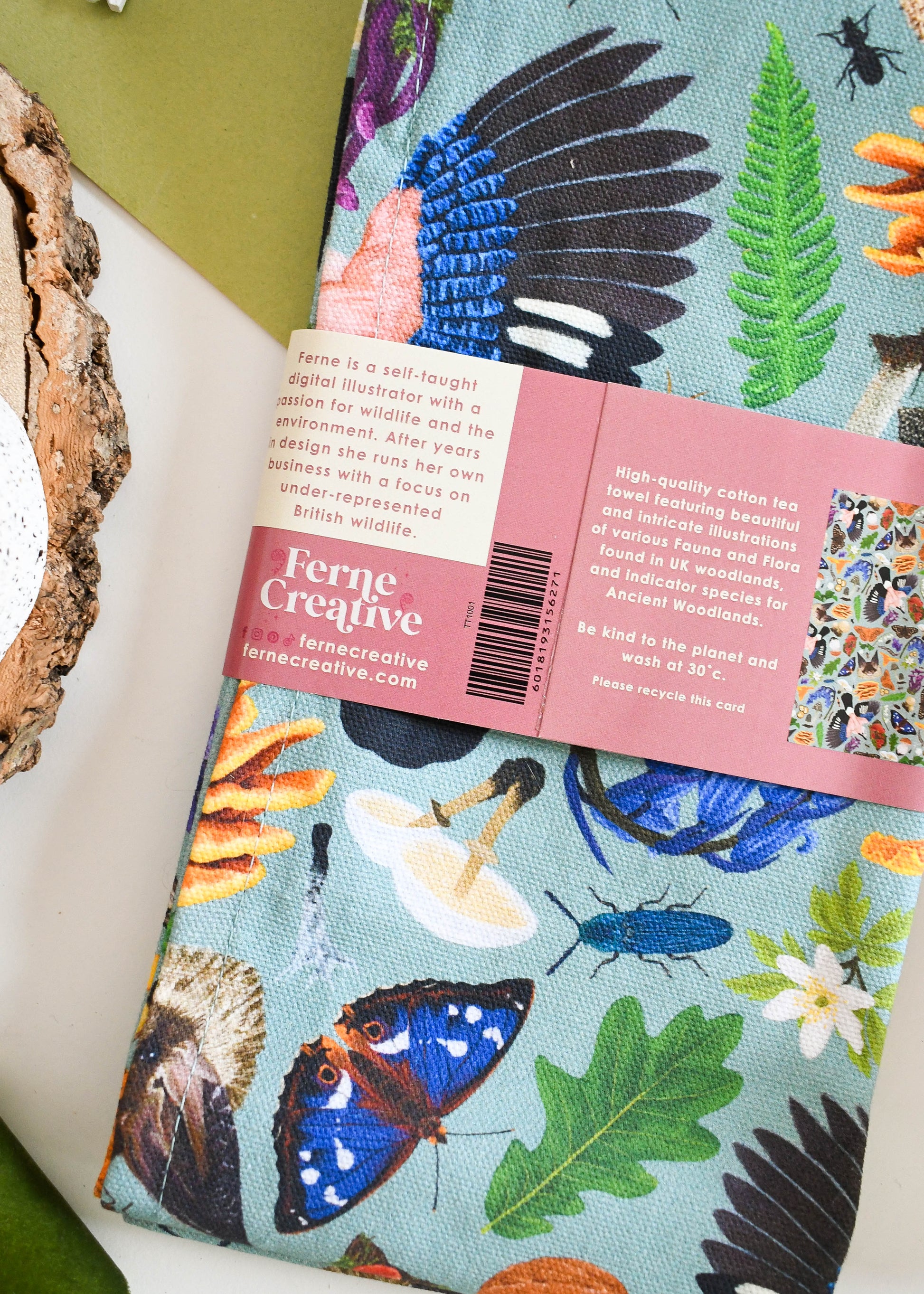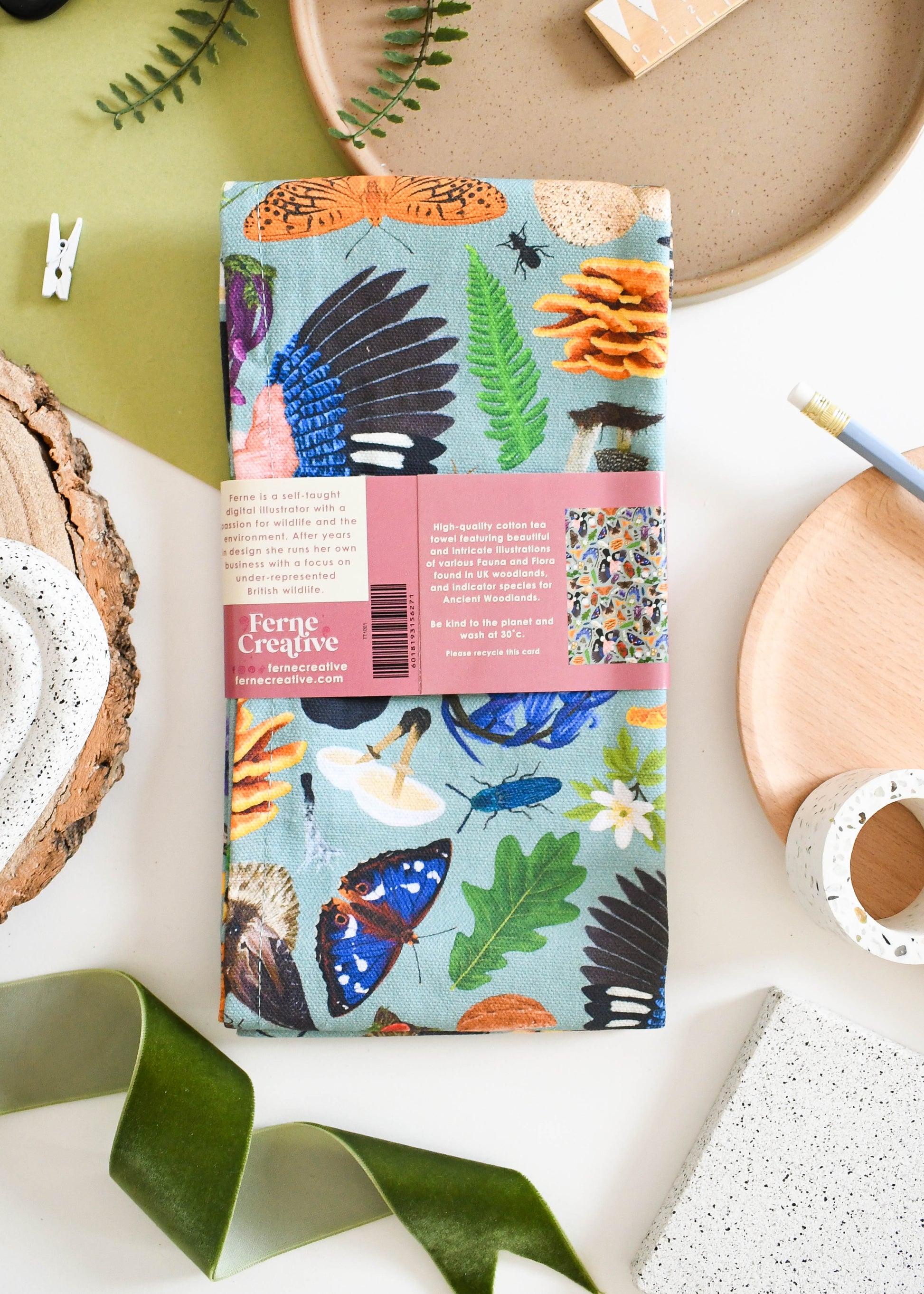 Inspired by Britain’s ancient woodlands, this tea towel features a detailed study of native flora and fauna, from the bright feathers of the jay to bracket fungi, wildflowers, and the long-eared bat. Set against a soft blue background, the design draws from natural history illustration, creating a piece that is both practical and quietly observational - a glimpse of woodland life for everyday use in the kitchen.