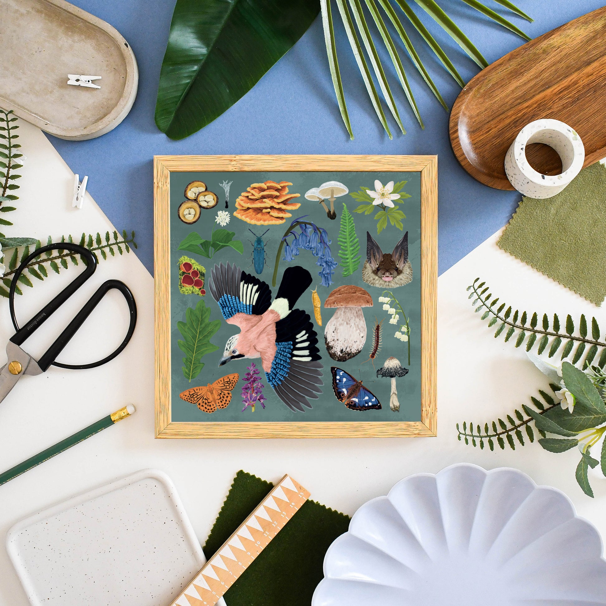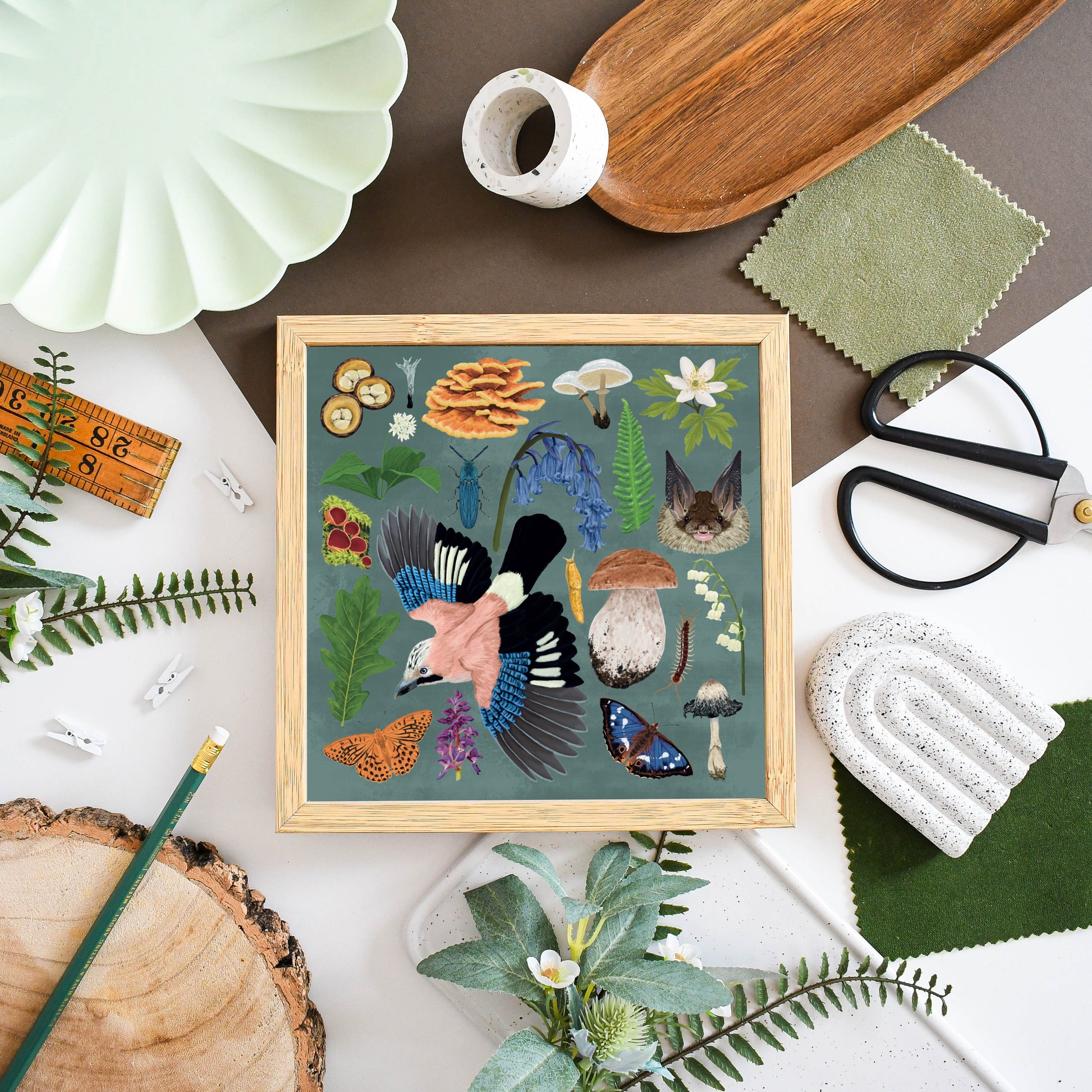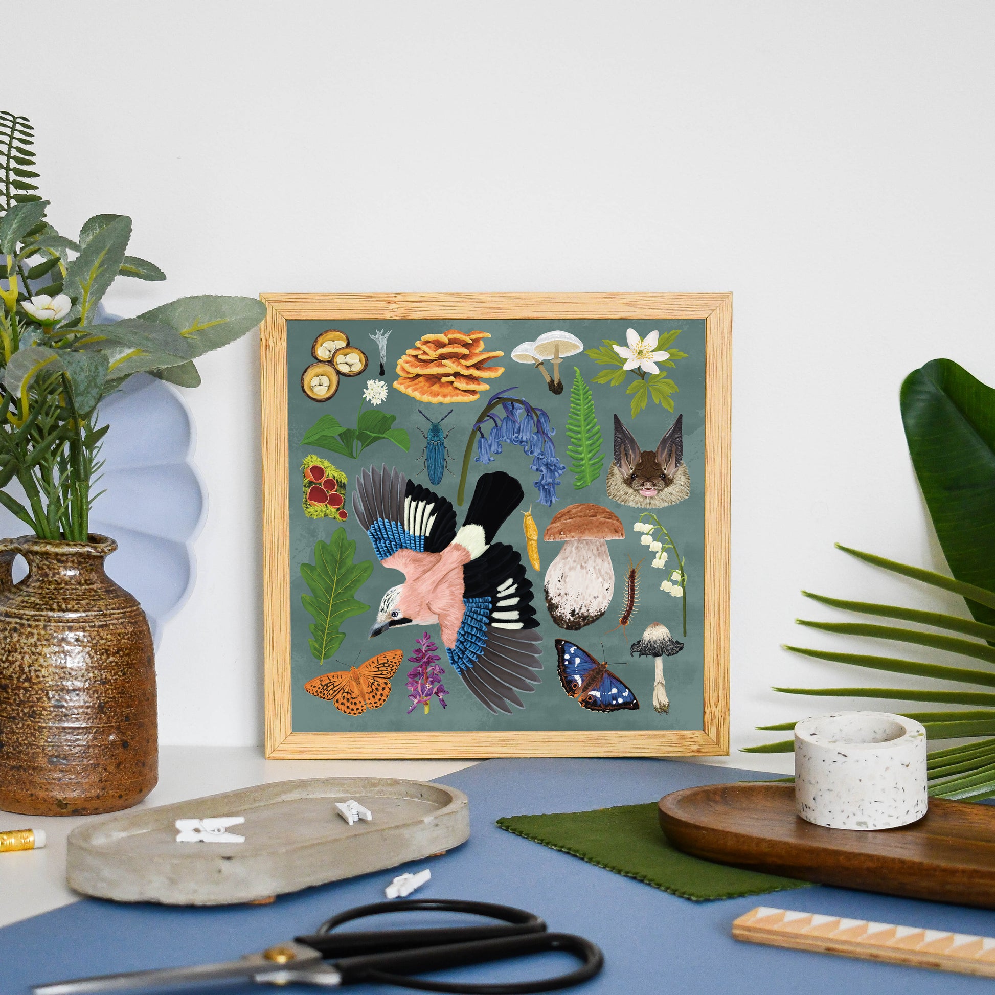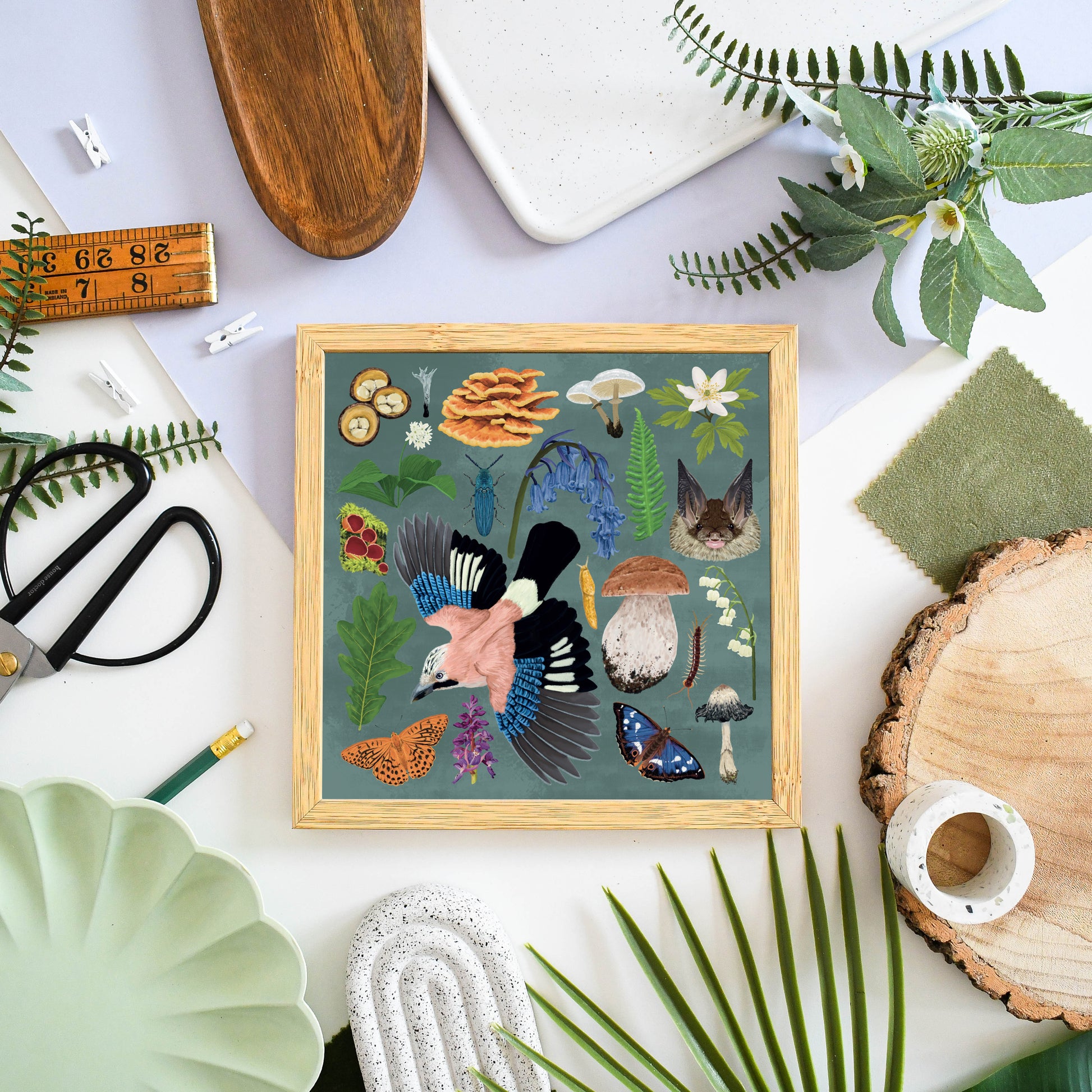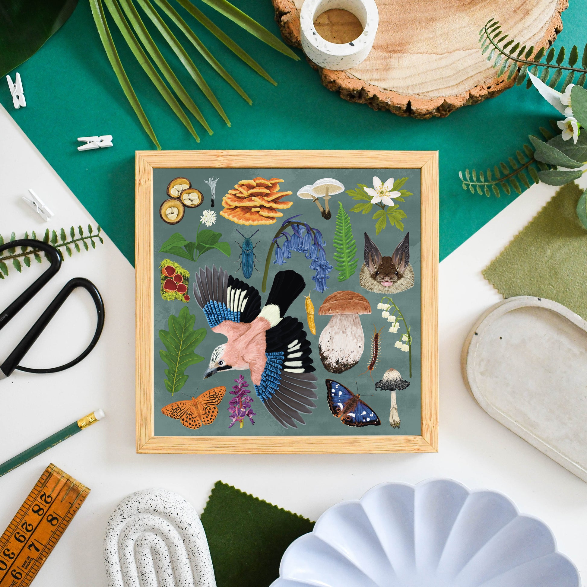 Dappled light filters through ancient woodland in this square wildlife art print, celebrating the diversity of species that inhabit Britain’s oldest forests. Illustrated in a naturalistic style, the artwork features fungi, plants, insects, birds, and mammals, highlighting the richness of these complex ecosystems.