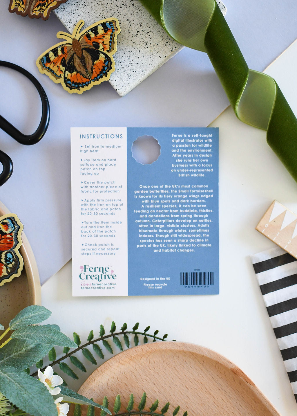 Small Tortoiseshell butterfly patch – orange and black patterned wings edged with blue crescents