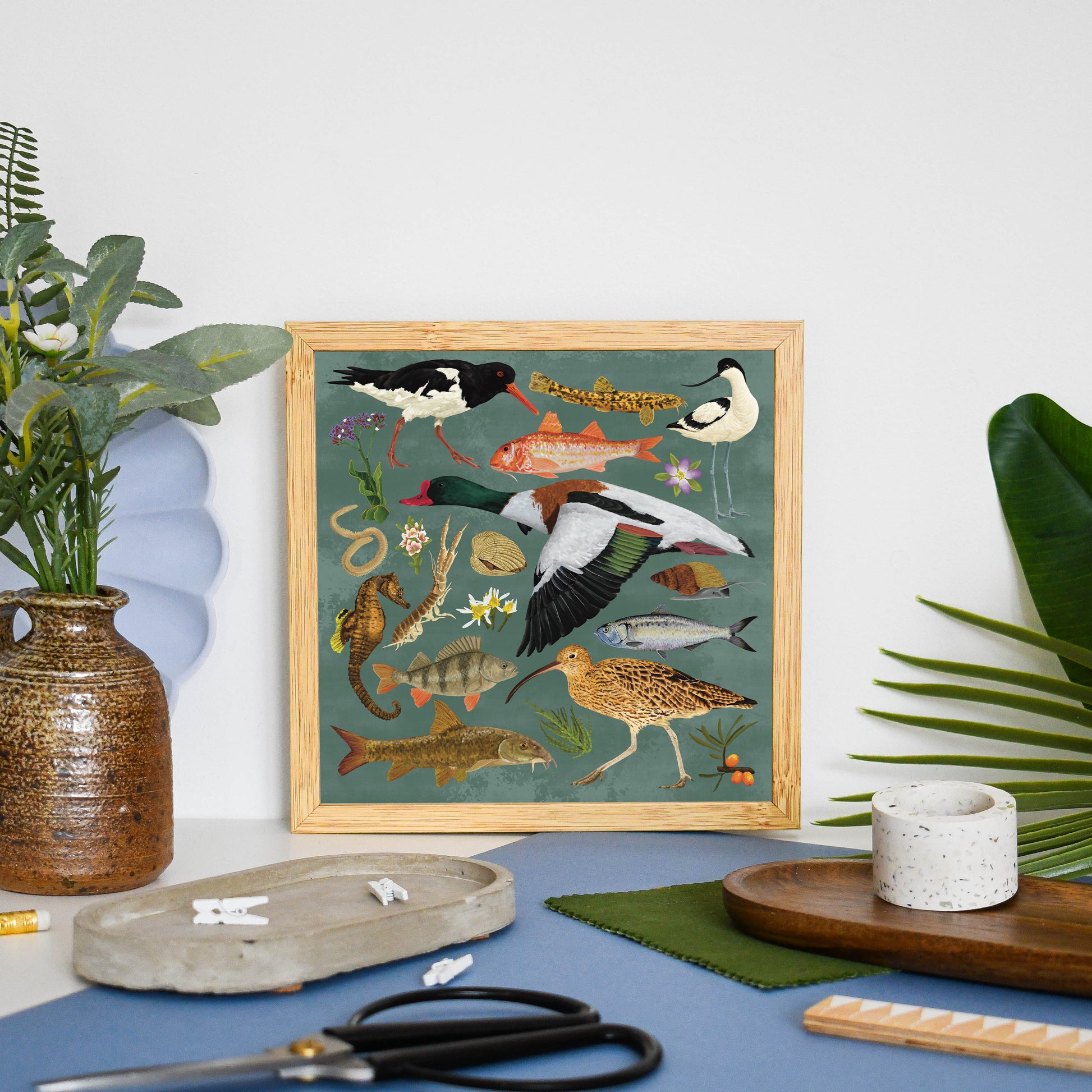 The dynamic and productive estuary habitat is captured in this square wildlife art print, illustrating the variety of species that thrive where rivers meet the sea. Illustrated in a naturalistic style, the artwork features birds, fish, invertebrates, and plants characteristic of Britain’s estuarine ecosystems.