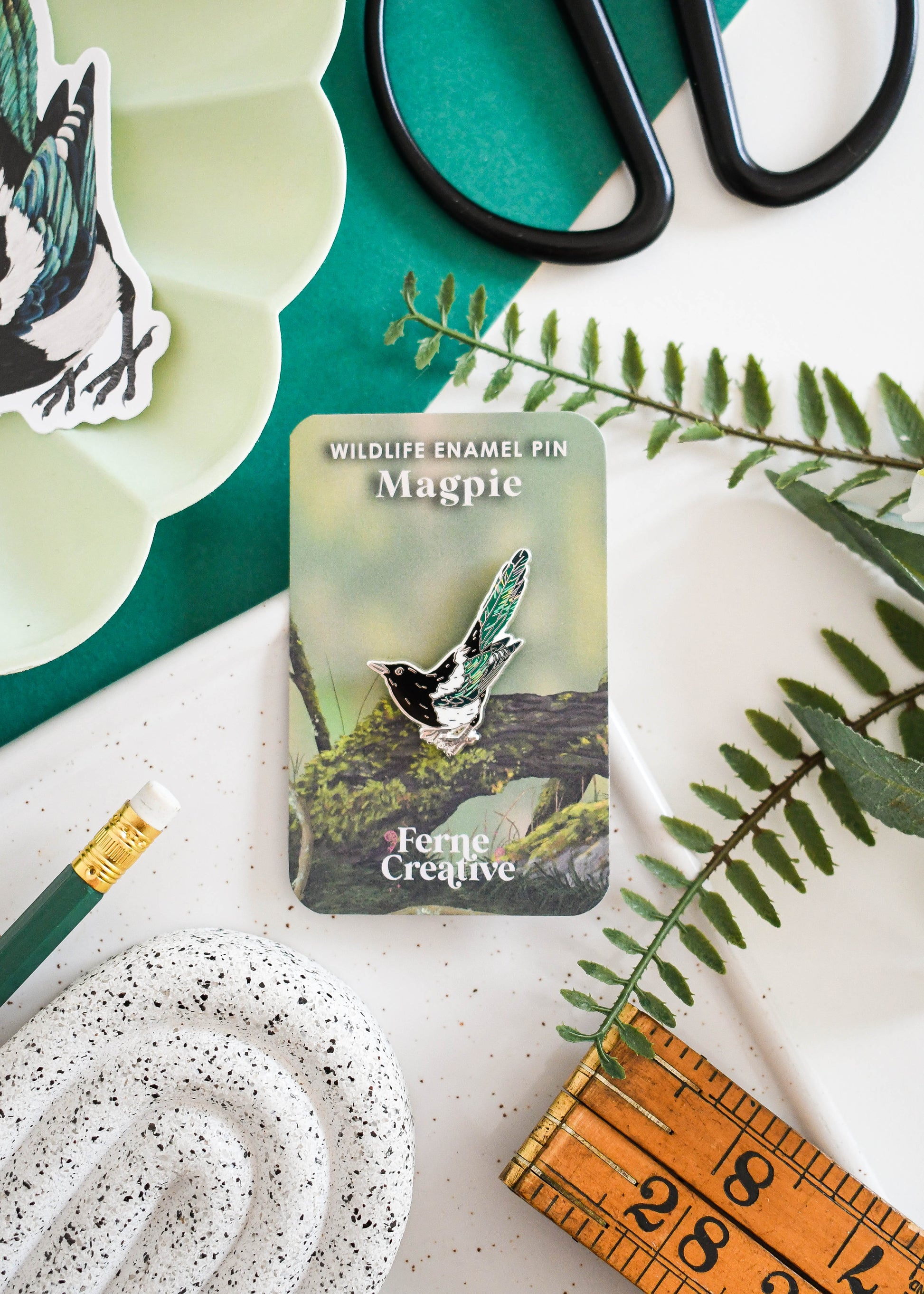Each pin is presented on a specially illustrated backing card, depicting the Eurasian Magpie in its natural woodland setting, adding an extra artistic touch.