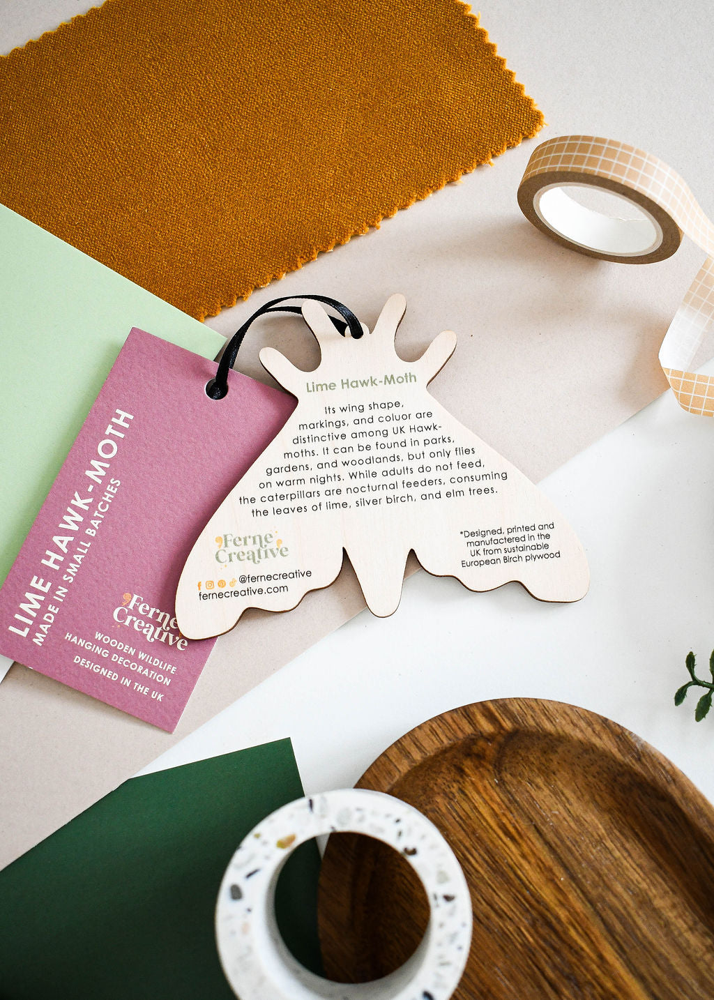 The Lime Hawk-Moth wooden hanging decoration is perfect for your Yule tree or everyday home decor. This intricately illustrated ornament showcases the stunning details of this moth, known for its olive-green wings and distinctive pinkish patches. Handcrafted from sustainably sourced birch plywood, it captures it's unique beauty, which is most active during warm nights and often mistaken for a hummingbird due to its hovering flight. On the reverse side, you’ll find these and other intriguing facts about the Lime Hawk-Moth, making it a true celebration of nature's wonders.