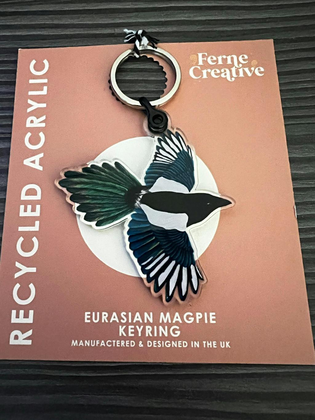 Add a unique finishing touch to your keys with this charming magpie keyring! Crafted from 100% recycled plastic, this acrylic keychain is sure to turn heads and make for an eco-friendly gift for any nature lover. Featuring a detailed illustration of a magpie and complete with an acrylic charm, this keyring truly captures the beauty of this majestic bird, plus it’s lightweight.