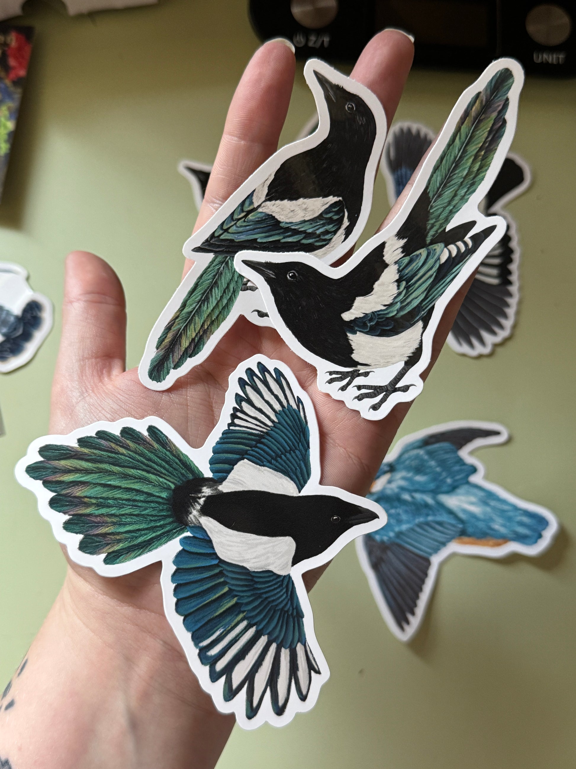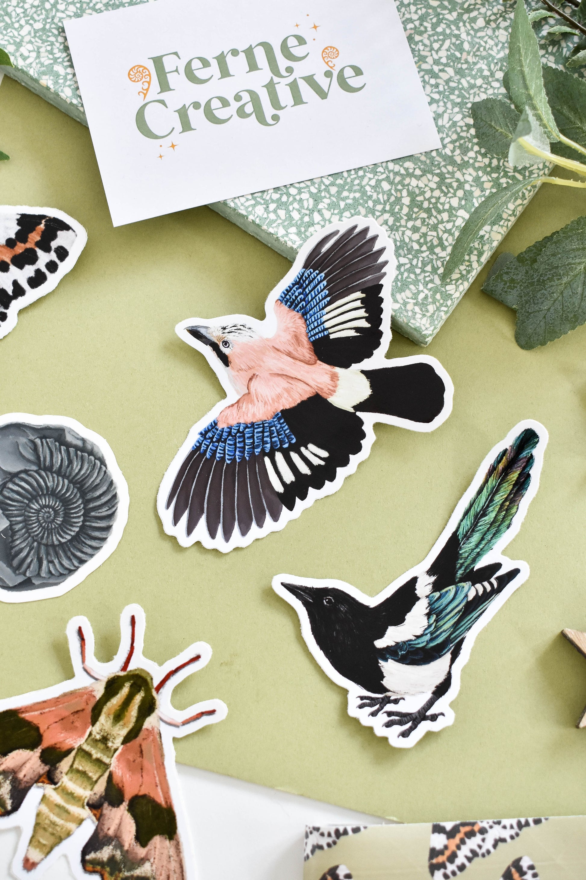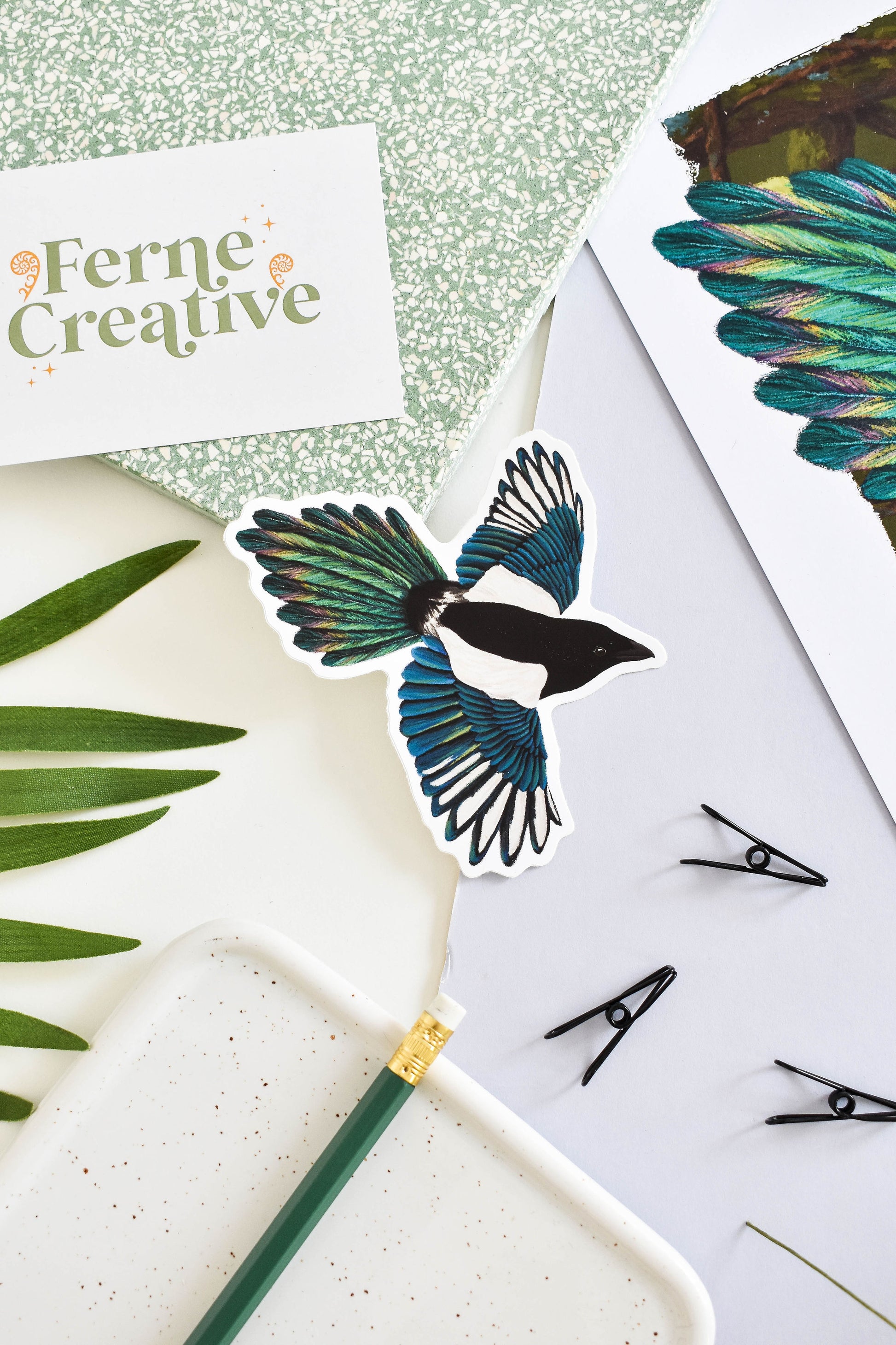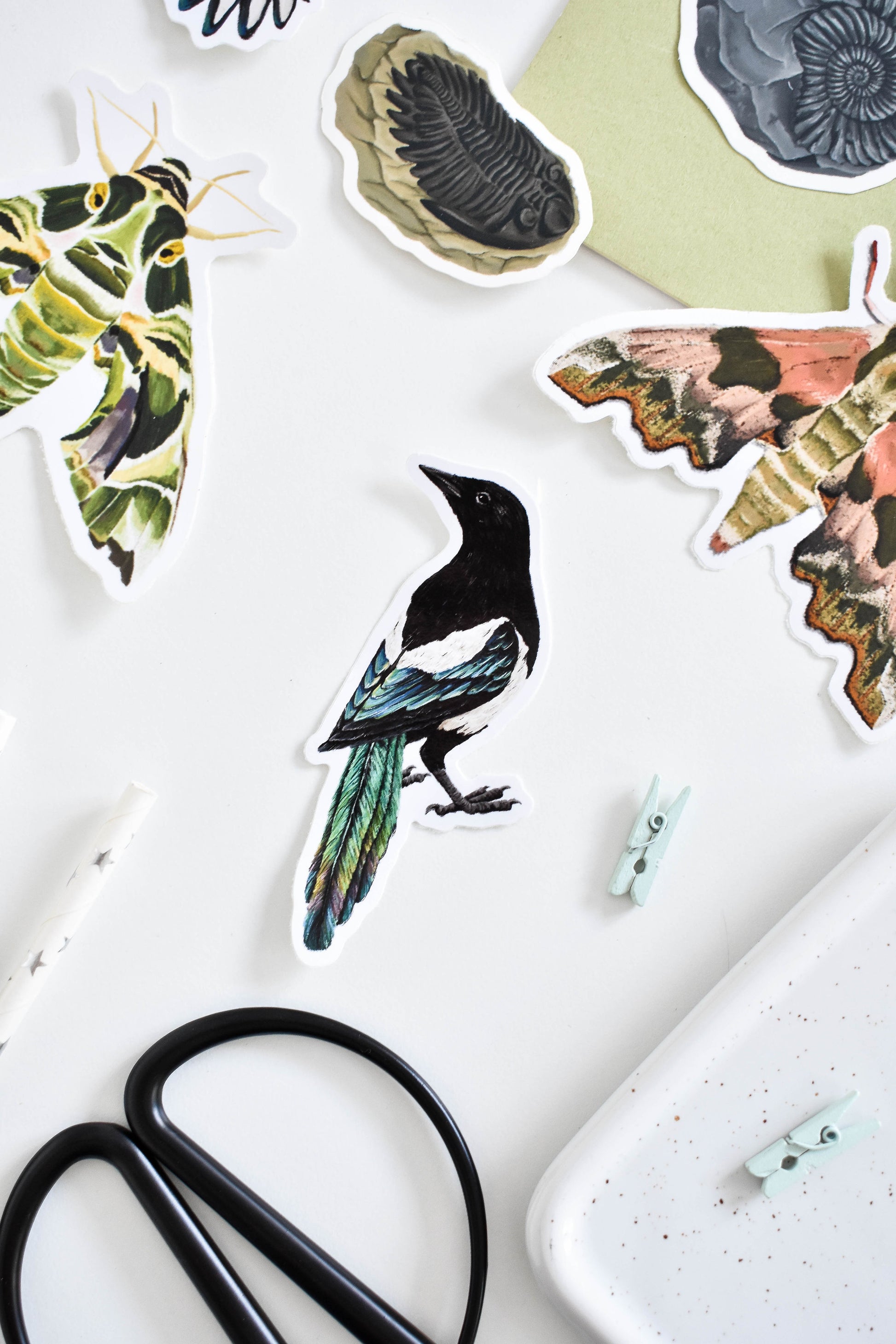 Celebrate the charm and intelligence of one of nature's most captivating birds with our Magpie Sticker Bundle—a best-selling trio featuring three unique illustrated designs. Each die-cut vinyl sticker captures the magpie's striking black-and-white plumage, colourful tail feathers and expressive personality. This Magpie Sticker Bundle is a must-have for bird lovers and art aficionados alike, perfect for personalising your water bottles, laptops, notebooks, or any space that needs a touch of avian elegance.