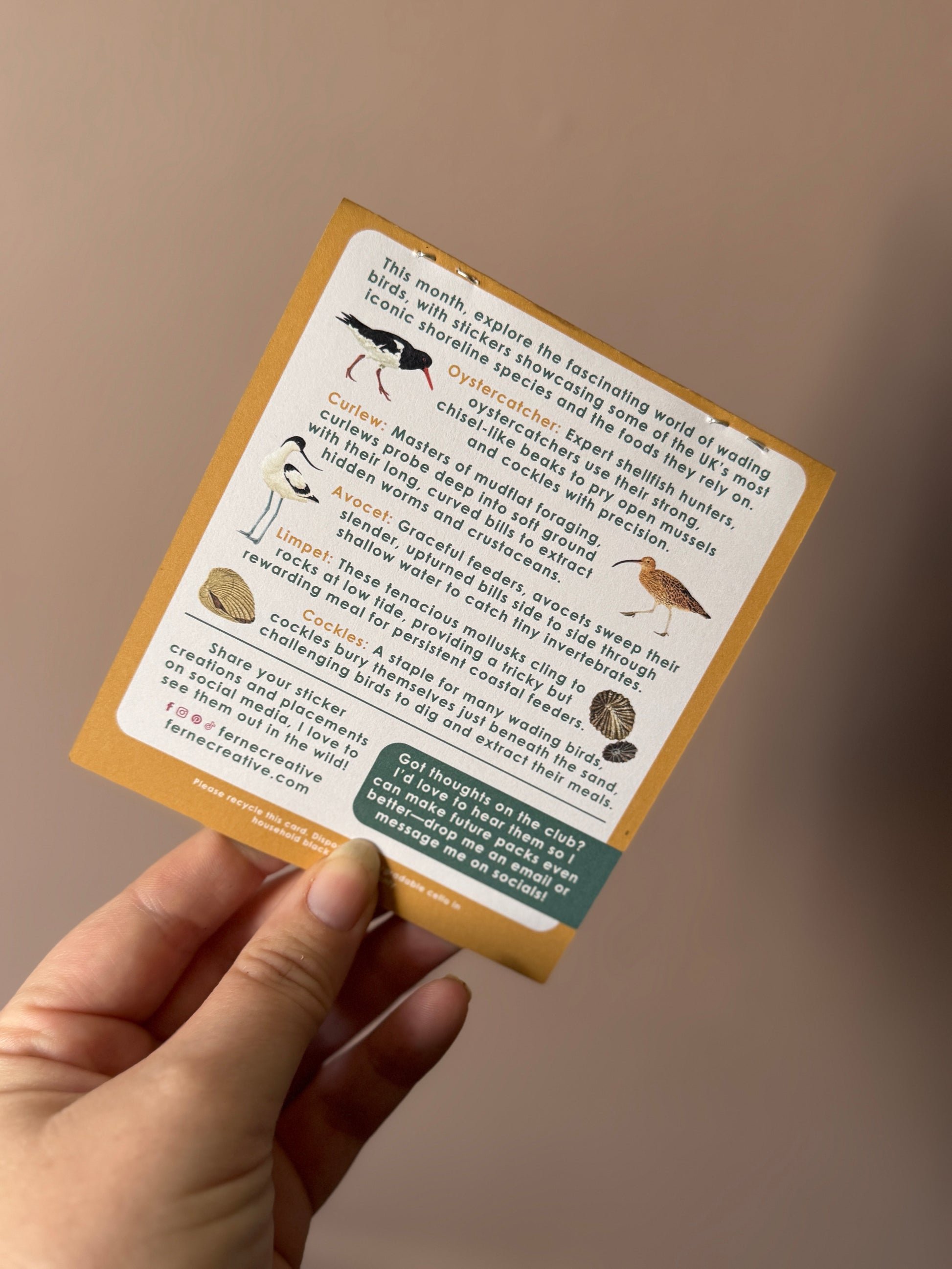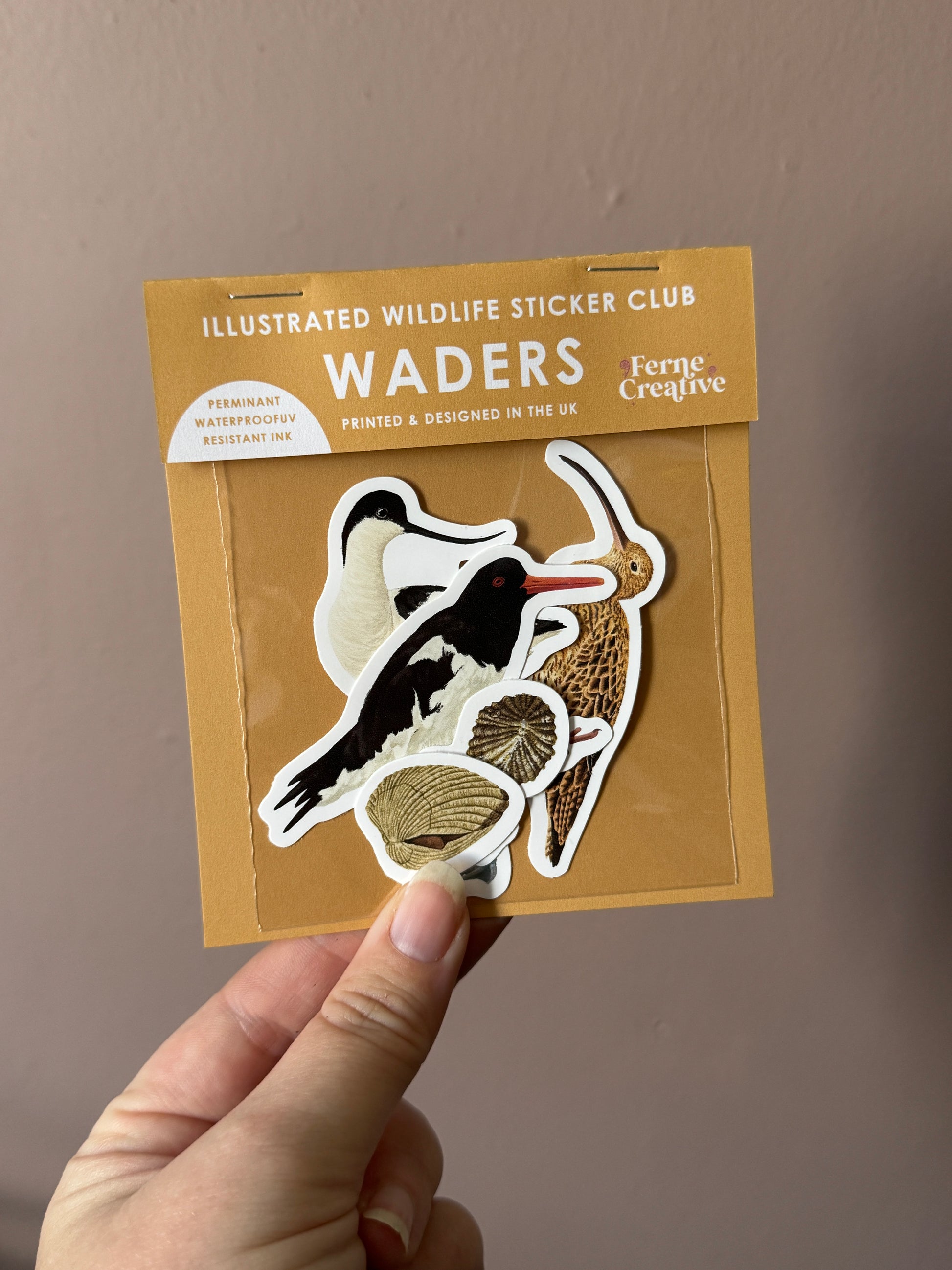 Discover the beauty of the UK's coastal wildlife with this one-off Wading Birds sticker pack, originally featured in my exclusive monthly sticker club! This pack celebrates four iconic shorebirds: the elegant Avocet, the long-billed Curlew, the striking Oystercatcher, and a selection of mini stickers featuring Cockle and Limpet shells—perfect for adding an extra touch of nature to your collection.