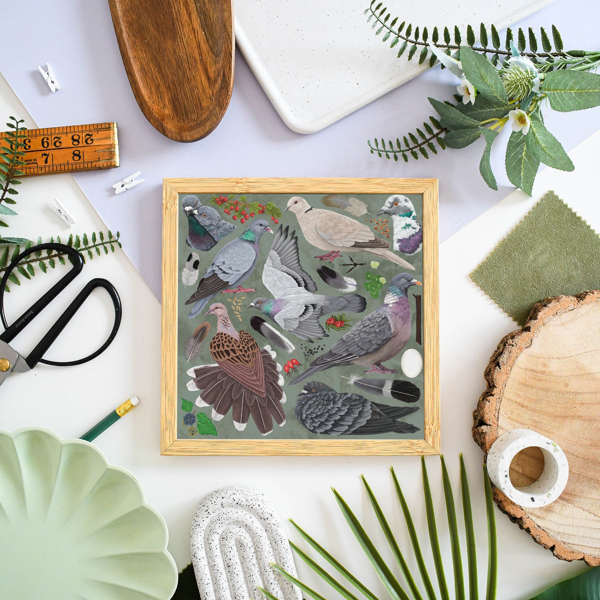 A carefully illustrated square wildlife art print celebrating the variety of pigeons and doves found across the UK. This piece brings together several familiar and lesser-noticed species, alongside details of their feathers, eggs, and natural food sources, all arranged against a soft light green background. The artwork is rendered in a naturalistic style, highlighting both subtle differences and shared characteristics within this group of birds.